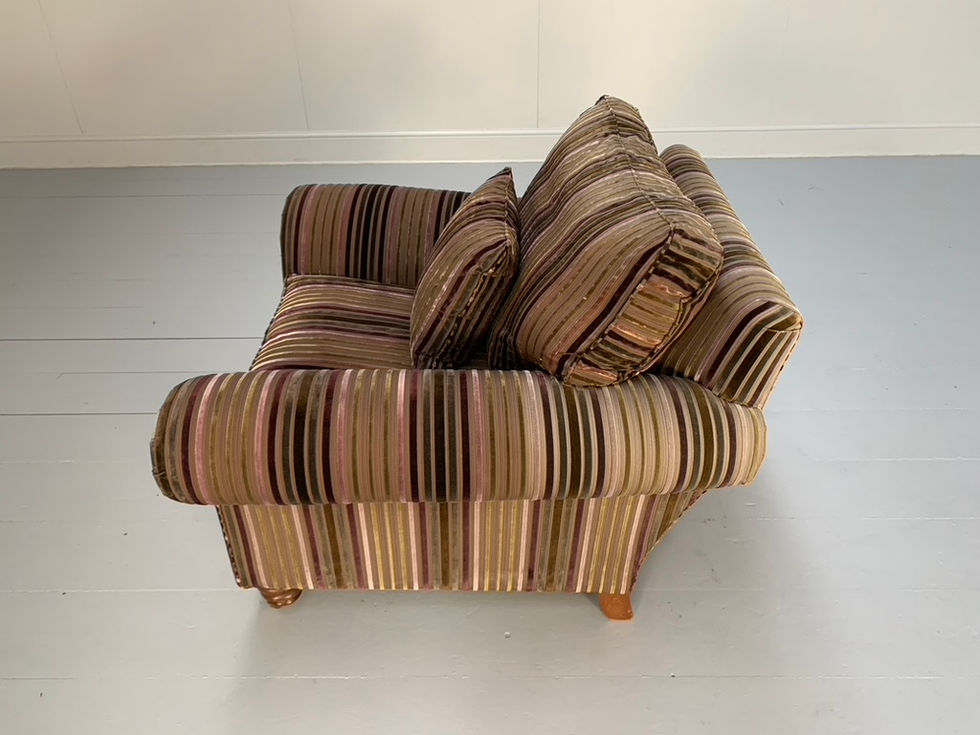 This is an ultra-rare opportunity to acquire what is, unequivocally, the best of the best, it being a most elegant pair of Duresta “Watson” Armchairs, both dressed in an identical beautiful, relaxed, high-grade Velvet Stripe fabric in a myriad of colours including Purples, Greens, Greys and Browns.
