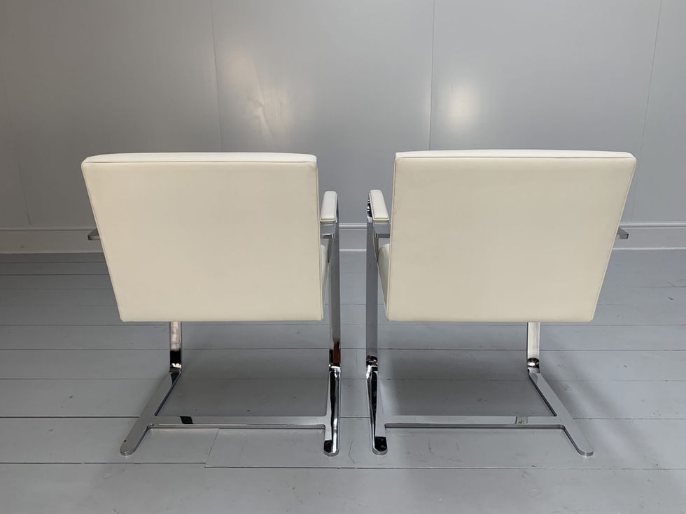 On offer on this occasion is a sublime, immaculately-presented, original pair of “Brno Flat Bar” Armchairs with Arm Pads in White Leather, manufactured by the leading Furniture manufacturer, Knoll Studio.