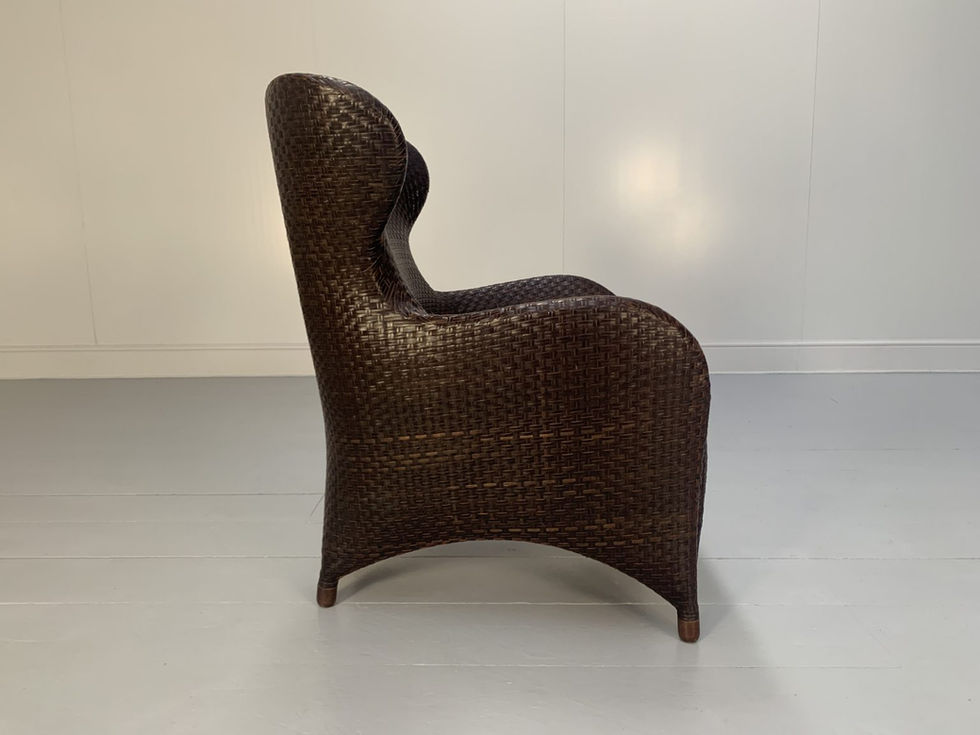 On offer on this occasion is the rarest of the rare (in fact, i have never seen such a thing before, and have been unable to identify another one available for sale since i was lucky enough to acquire it), with the piece in question being a peerlessly-executed woven-armchair and footstool, which has been painstakingly hand-woven in a luxurious, top-grade, gently-vintaged saddle-leather in dark-brown.