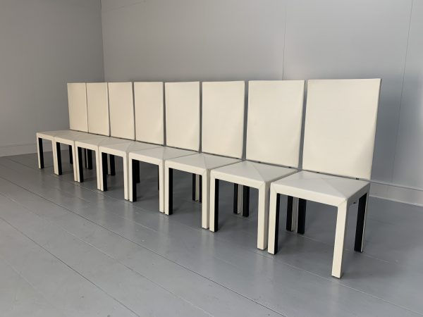 This is an ultra-rare opportunity to acquire what is, unequivocally, the best of the best, it being a most spectacular, beautifully-presented 8-piece suite of B&B Italia “Arcadia” Dining Chairs (consisting of 6 chairs and 2 carver armchairs), all dressed in a tactile, accommodating white “Gamma” leather.