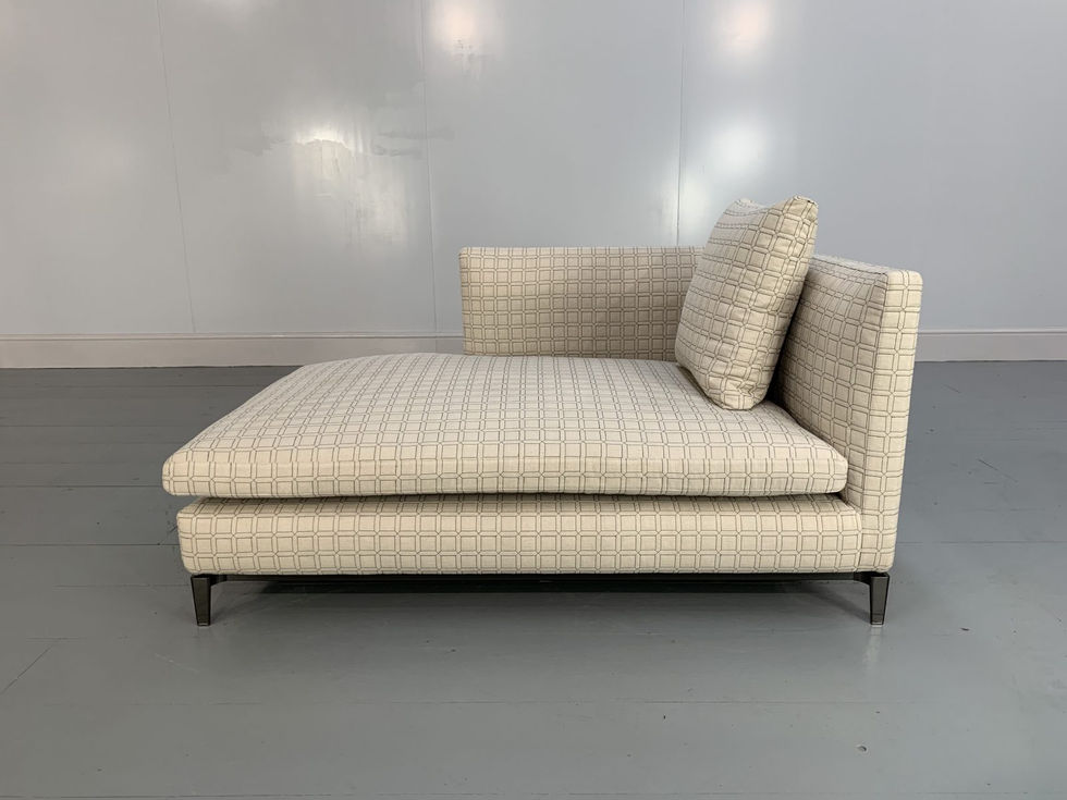 On offer on this occasion is a superb, identical pair of Minotti “Andersen” Chaise Sofas (which, as you will see, can be configured to create a sofa/daybed) dressed in a peerless, top-grade natural, neutral-linen fabric with a geometric, woven-pattern in black, and with Gunmetal base-trim.